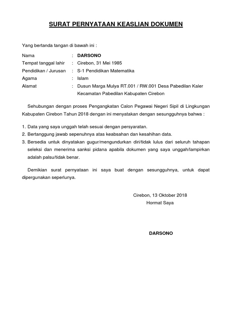 Saya yang bertanda tangan di bawah ini saya bersedia didiskualifikasi sebagai pendaftar dan menerima sanksi/diproses sesuai prosedur dan ketentuan hukum yang berlaku apabila dokumen, data, informasi, dan/atau keterangan tersebut tidak. Apabila diperlukan, saya bersedia memberikan. Demikian surat pernyataan ini saya buat dalam keadaan sadar tanpa ada tekanan dari pihak manapun juga, dan saya bersedia dituntut di pengadilan apabila dikemudian hari terbukti bahwa pernyataan saya ini tidak benar. Posted by ptspgelora at 6:15 am. Silhakan disimak pola surat berikut ini. Berisi contoh surat pernyataan lengkap dengan formatnya. Keabsahan dokumen ( dokumen asli ) 3. Apabila surat pernyataan ini tidak benar, maka saya bersedia diberi sanksi akademik yang ditetapkan oleh pimpinan fakultas atau pimpinan universitas lampung. Dokumen atau bukti fisik untuk ppg akan di cek secara langsung ke absahannya atau kebenarannya oleh asesor. Surat pernyataan kebenaran atau keabsahan dokumen atau data banyak dibutuhkan oleh seseorang atau kelompok sebagai dokumen pelengkap da. Contoh surat keabsahan dokumen import barang dibuat untuk memenuhi prosedur import custom clearance di indonesia di sertai juga surat. Persyaratan berkas administrasi beasiswa mahasiswa berprestasi. Ada satu jenis surat yang sangat penting yaitu surat pernyataan keaslian dokumen.